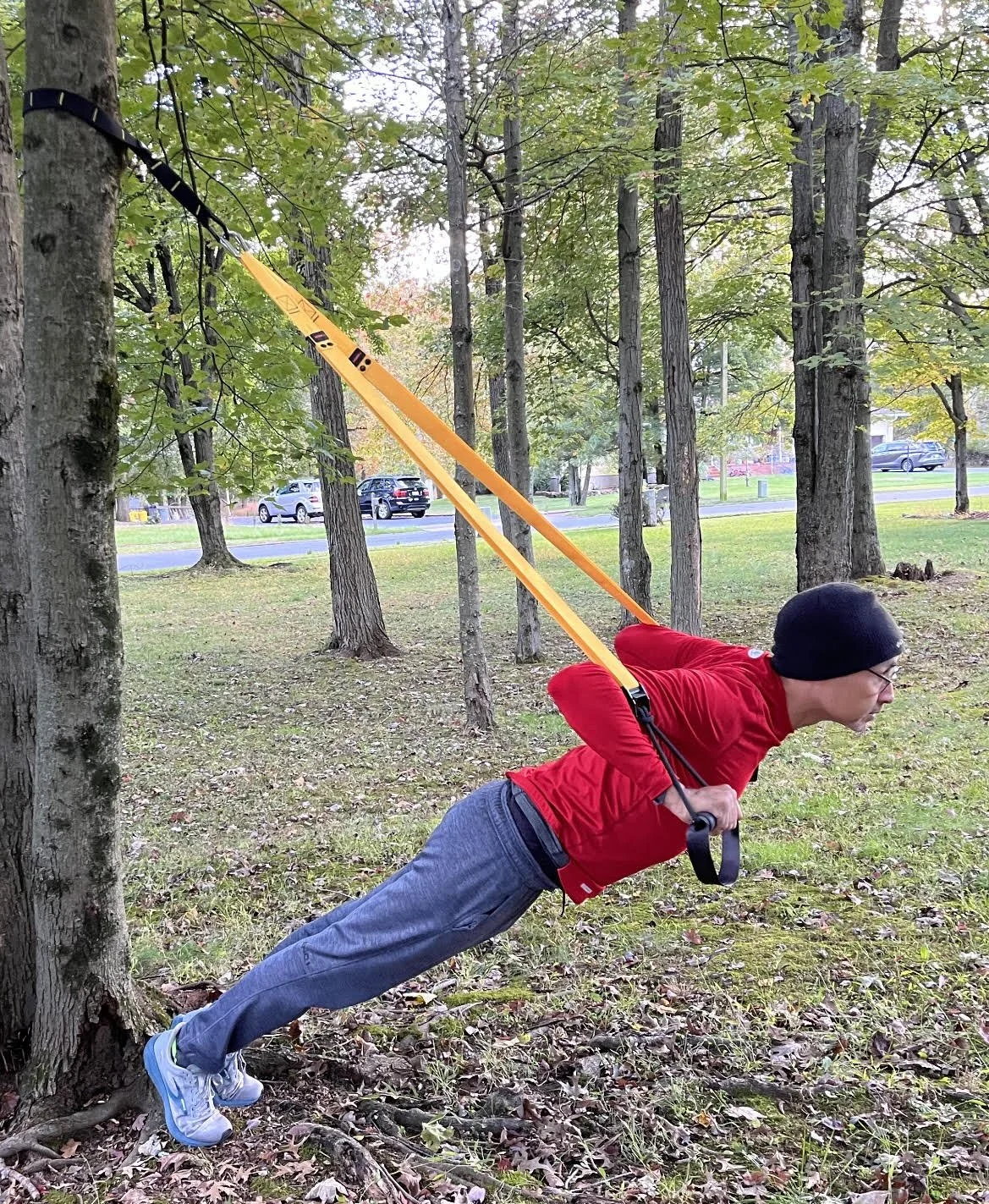 When you can’t get to the gym or just love the outdoors, suspension training is inexpensive, and time-saving—no waiting around for gym equipment to become available. You can achieve a full-body workout in a short period of time. Suspension Training is a favorite of mine